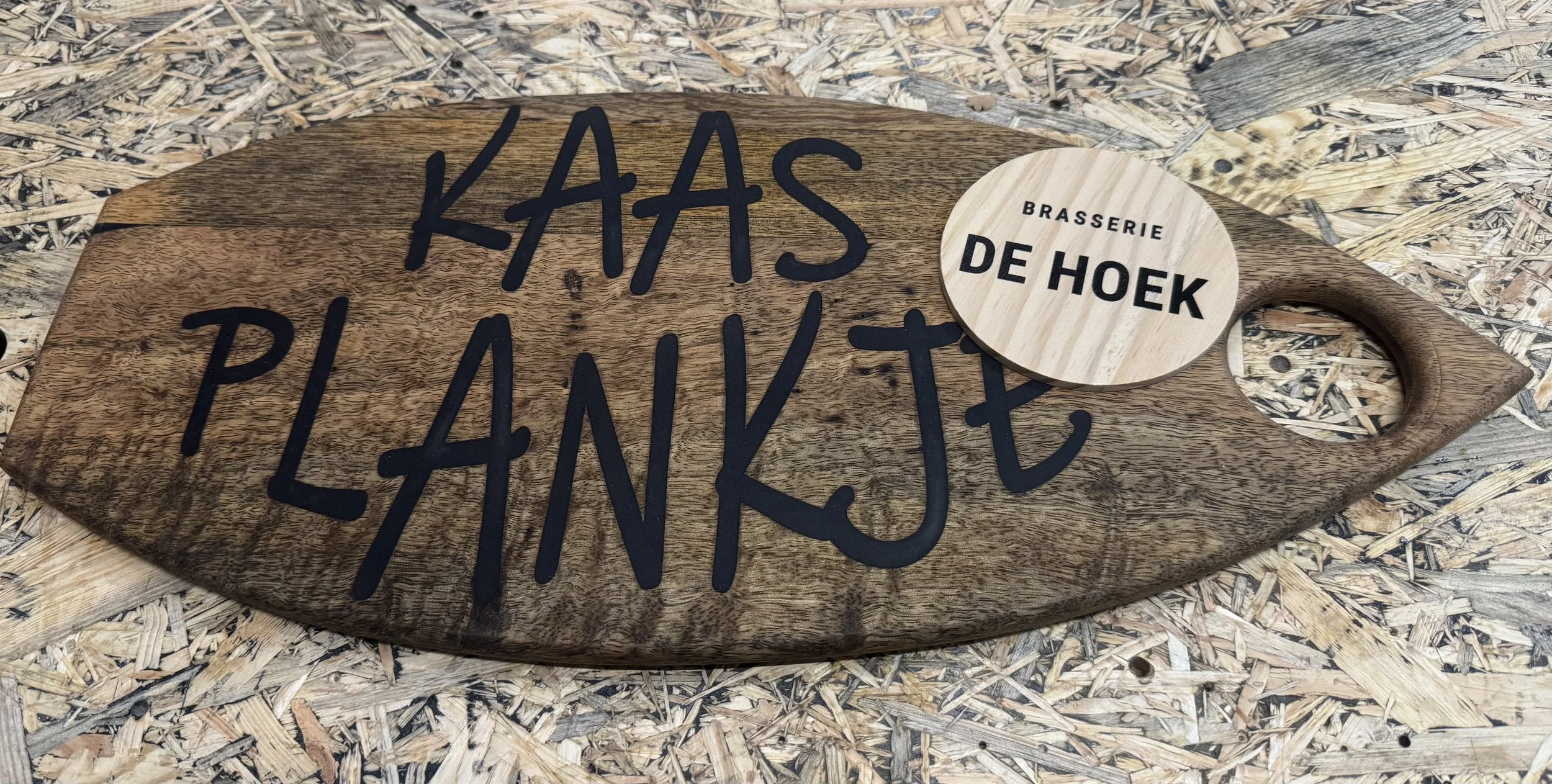 Denk aan UV-print, verf of epoxy — afhankelijk van de uitstraling die je zoekt.