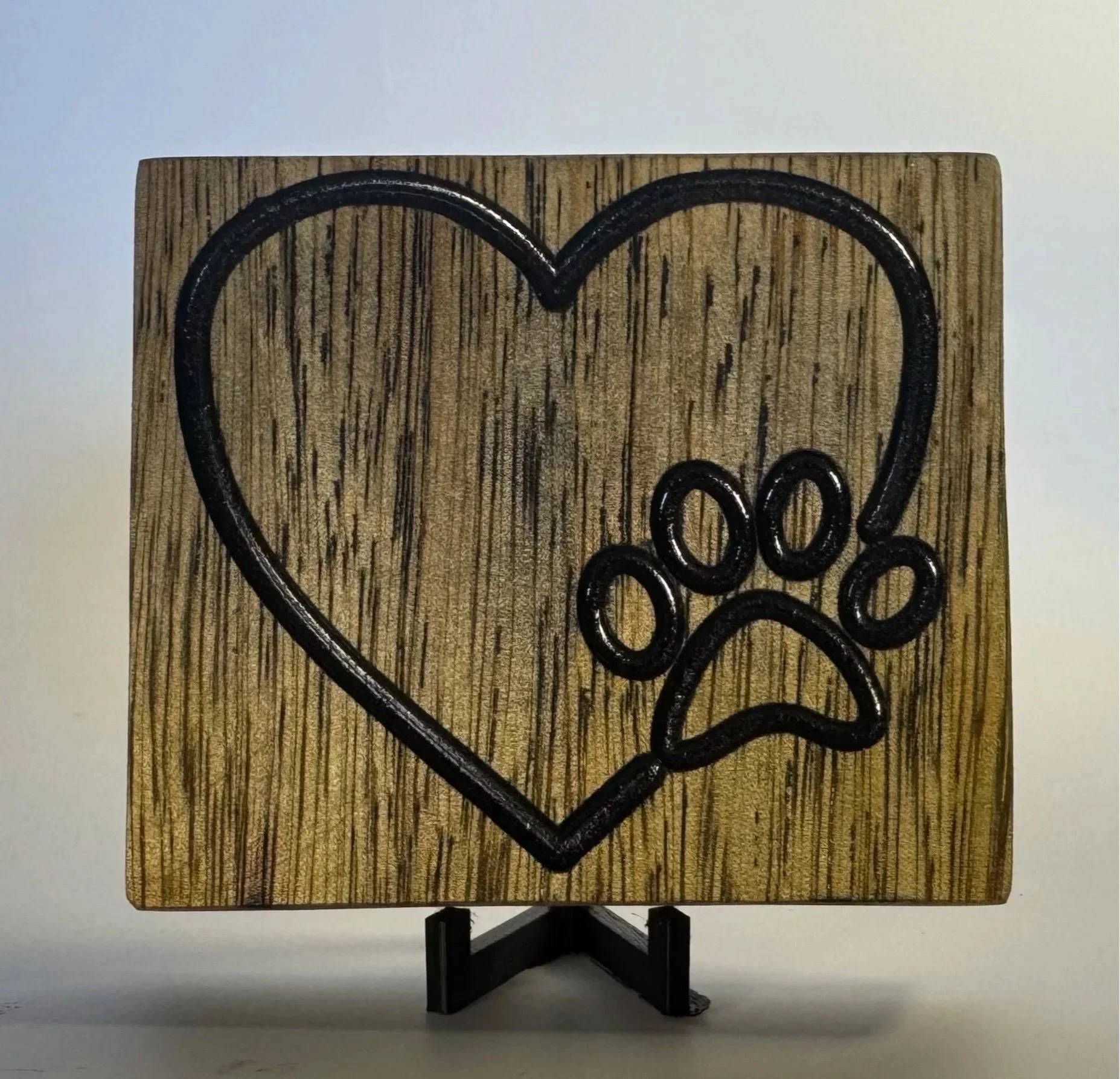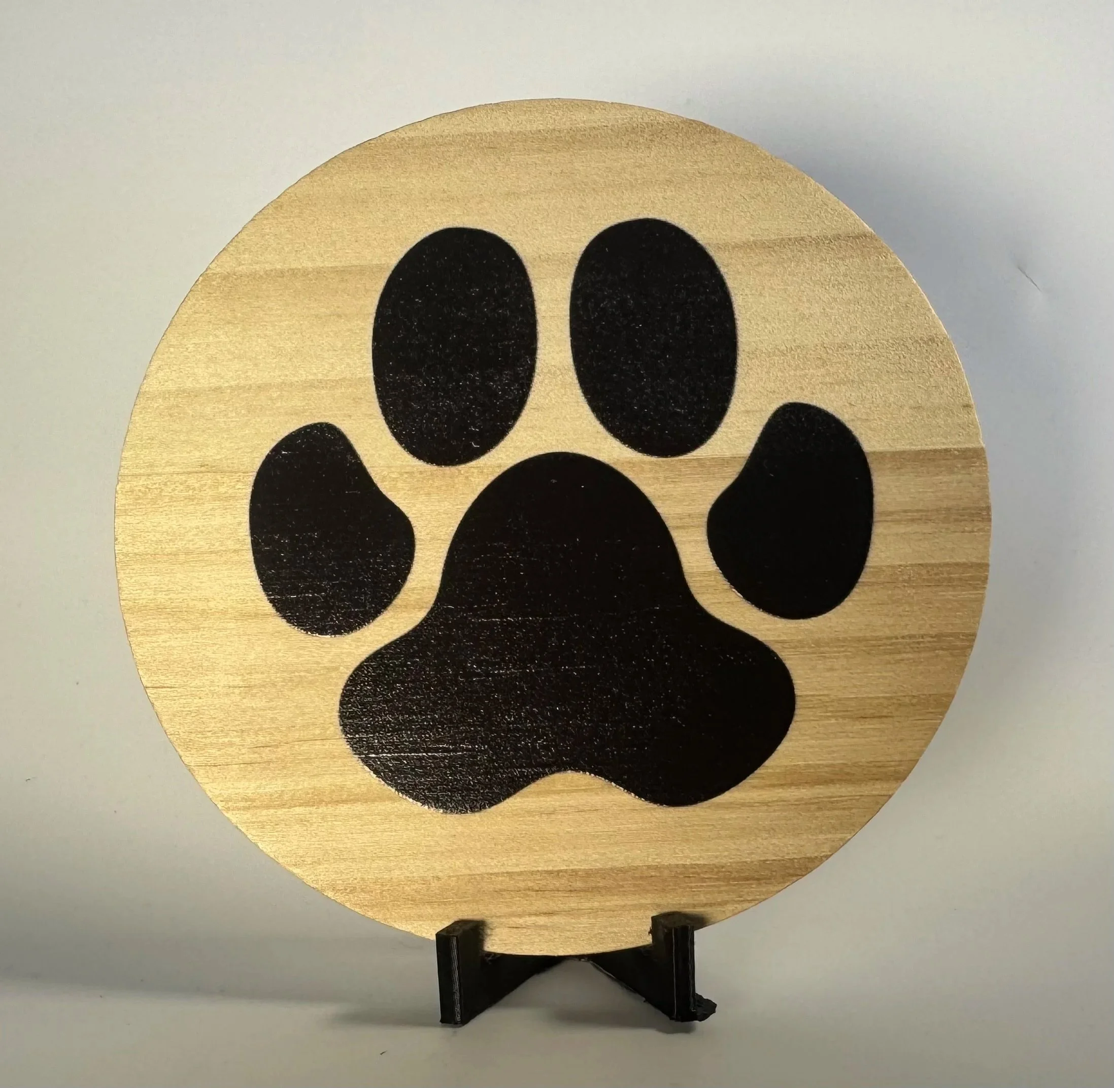 Houten onderzetter (±10 cm) met pootafdruk (UV-print).